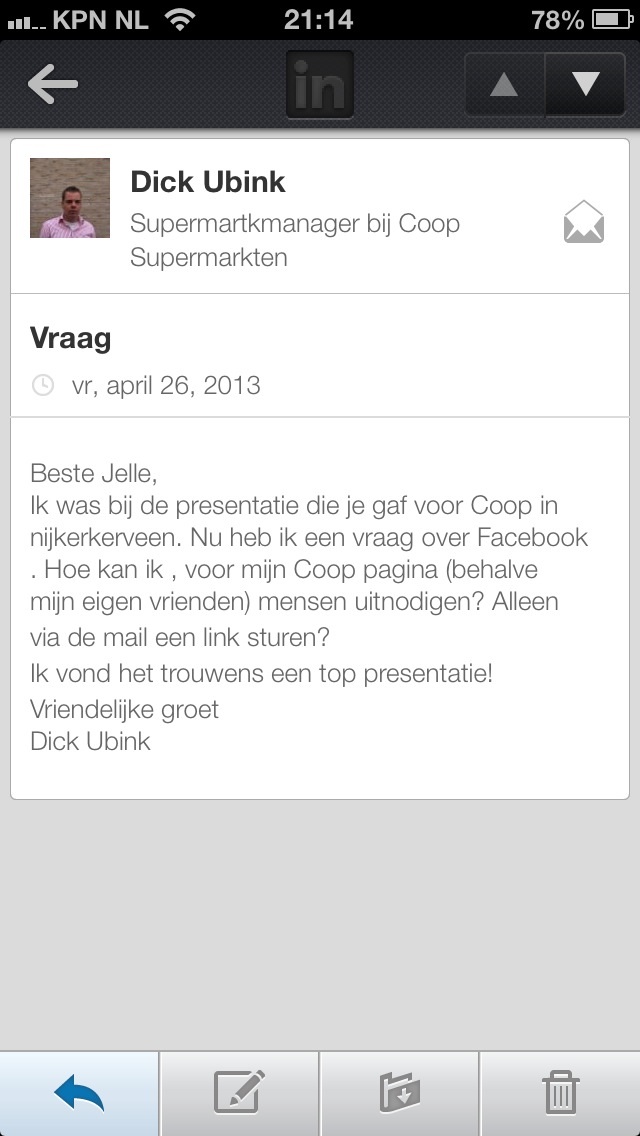De COOP sessie was erg leuk om te doen. Na afloop leuke reacties ontvangen; zowel direct er na als via Linkedin. Een compliment en een vraag kwam binnen van Dick Ubink. De vraag luidde: “Hoe kan ik vanuit mijn Facebook fanpage mensen uitnodigen om mijn pagina te liken?”.